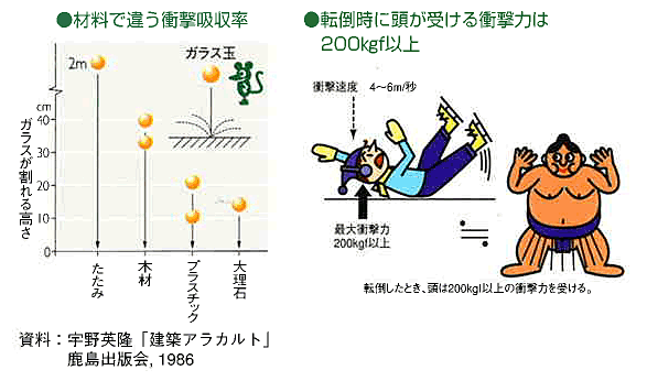 転んだ時、直接頭や顔を打った経験がある方も多いのではないでしょうか?その時、頭が地面や床に叩きつけられるスピードはなんと秒速4~6m、その最大衝撃力は200kg以上、なんと大きな相撲取りの体重と同じくらいの衝撃力になります。床が木でできていて助かっているかもしれませんね。こんなところでも、他の素材より衝撃吸収力のある木材の特性が生かされています。